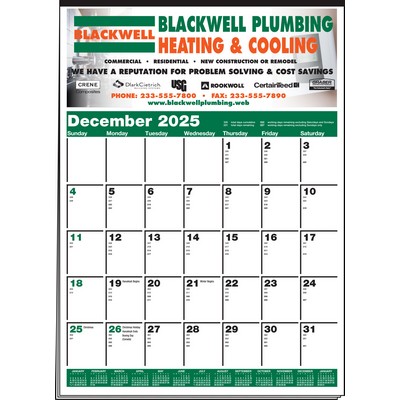 Get a hold of more customers when you offer this Memo Minders multi-sheet calendar. It's made of 50 lb. offset paper stock, features a stock green & black pad design with December top sheet (13-months - 13-sheets), and is tinned at the top with a loop. This also features Year-In-View® - which you can only get from us. It's the perfect way for your customers and prospects to plan their year with all the days "in view". Feature your full-color imprint on each sheet for maximum visibility. 19 1/2" W x 27" H