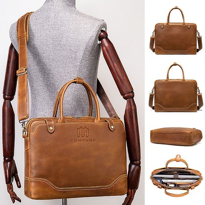 This business messenger bag is genuine crazy horse leather, ensuring a stylish and timeless look. With multiple pockets, this bag provides secure storage for all your essential items. The smooth zipper and shoulder straps offer stability while being easy to clean. This briefcase bag features an adjustable and detachable, shoulder strap for crossbody or over the shoulder wear, and also has a built in handle on top for hand use. 13 3/8" L x 3 1/8" W x 8 7/8" H