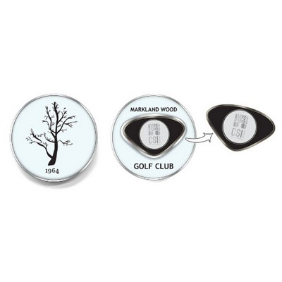 The MEDALLION COIN BALL MARKER is a 50mm zinc alloy marker with a chrome matte finish, perfect for corporate branding. It features three decoration areas: a full-color UV print on the front and partial back, and a removable custom or stock medallion in the back nest that doubles as a smaller marker. Personalize with D2 Silver medallion for added distinction. 4" L x 3.5" W x 0.25" H