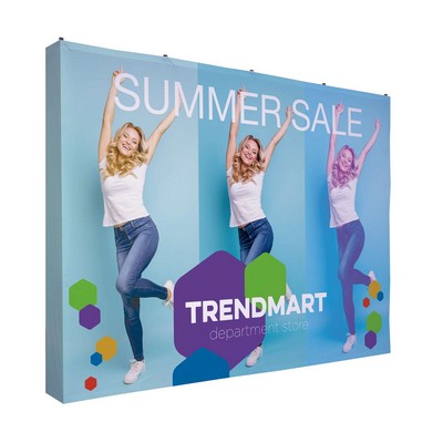 This pop-up display transforms from a compact unit to an impressive backdrop in minutes. Your artwork will be dye sublimated on recycled polyester knit; 100% recycled media. Graphic panel covers the front of the frame only. Hook-and-loop fasteners make graphic panel installation simple. Aluminum frame with nylon plastic hubs. Carry case included. Two-year warranty on hardware. Complies with Prop 65. 12.25" D x 119" W x 89.5" H